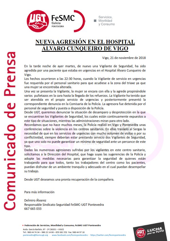 NUEVA AGRESIÓN EN EL HOSPITAL ALVARO CUNQUEIRO DE VIGO